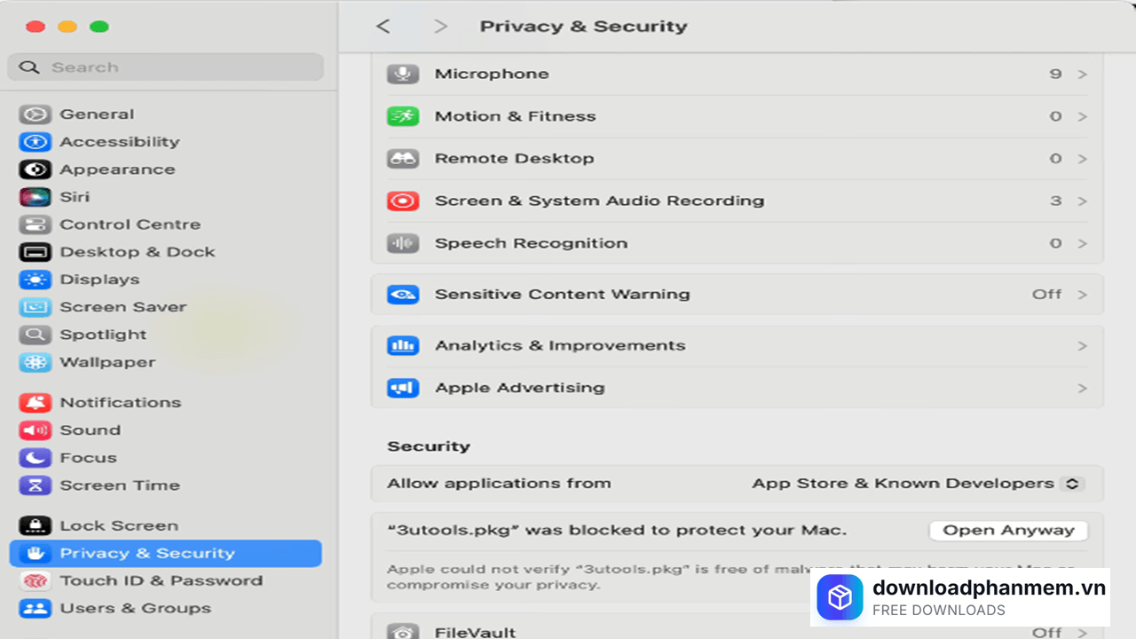 Bước 3: Tìm đến mục Privacy & Security (Quyền riêng tư & Bảo mật). Kéo xuống dưới cùng, bạn sẽ thấy thông báo "3uTools.pkg was blocked...". Nhấn vào nút Open Anyway (Vẫn mở)