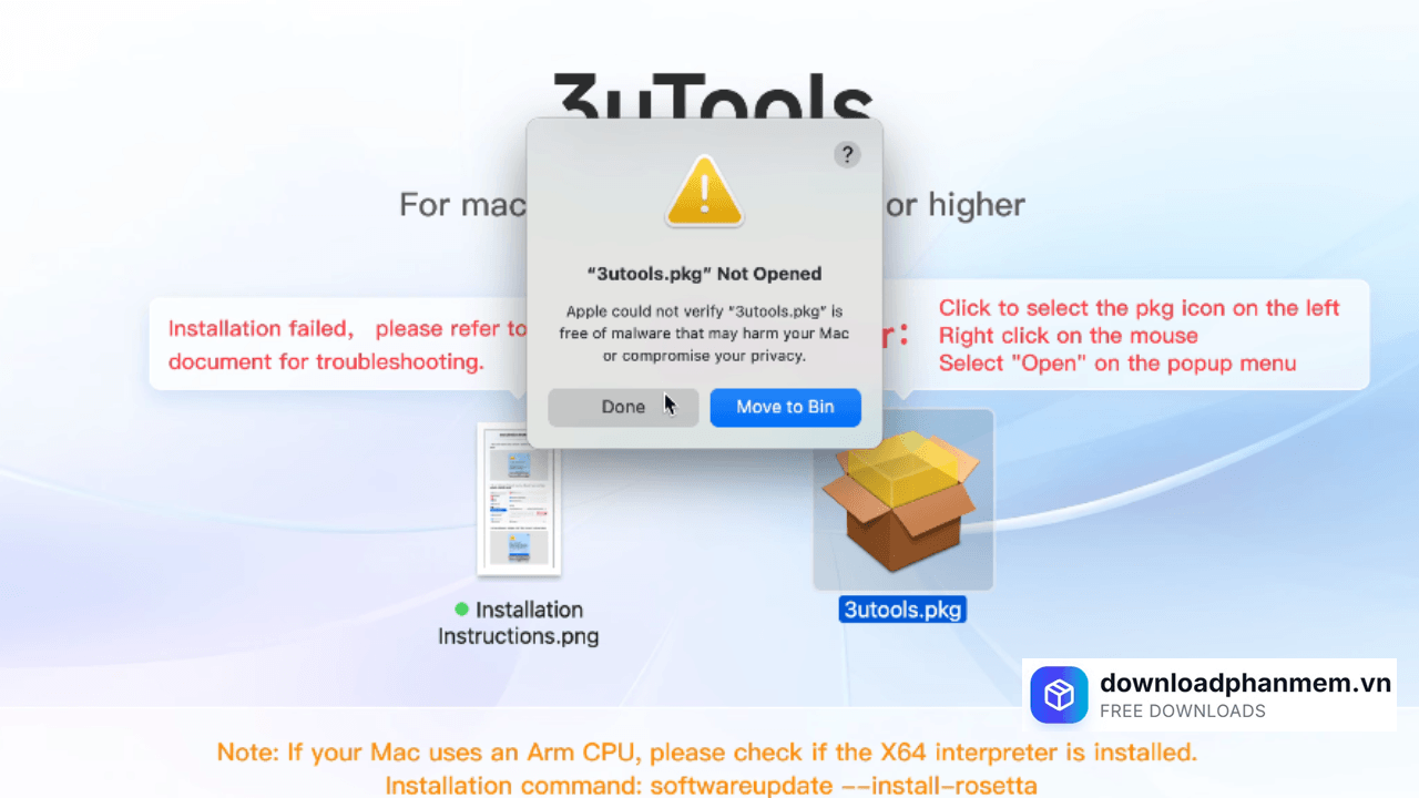 Bước 1: Mở file .pkg vừa tải. Nếu hiện thông báo "cannot be opened because it couldn't verify the developer", hãy nhấn Done