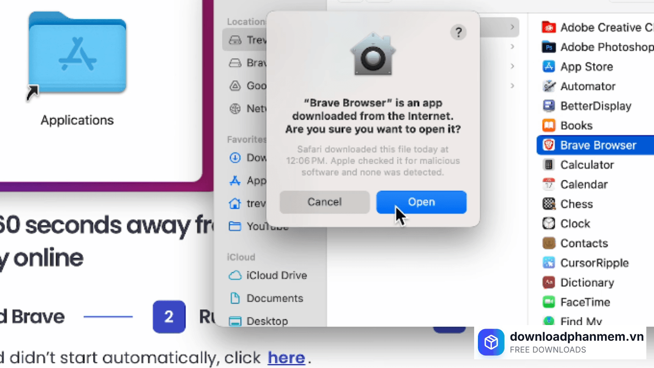 - Bước 4: Tìm Brave trong Launchpad hoặc Applications, click để mở. macOS có thể hỏi xác nhận vì đây là app tải từ Internet nhấn Open để tiếp tục.