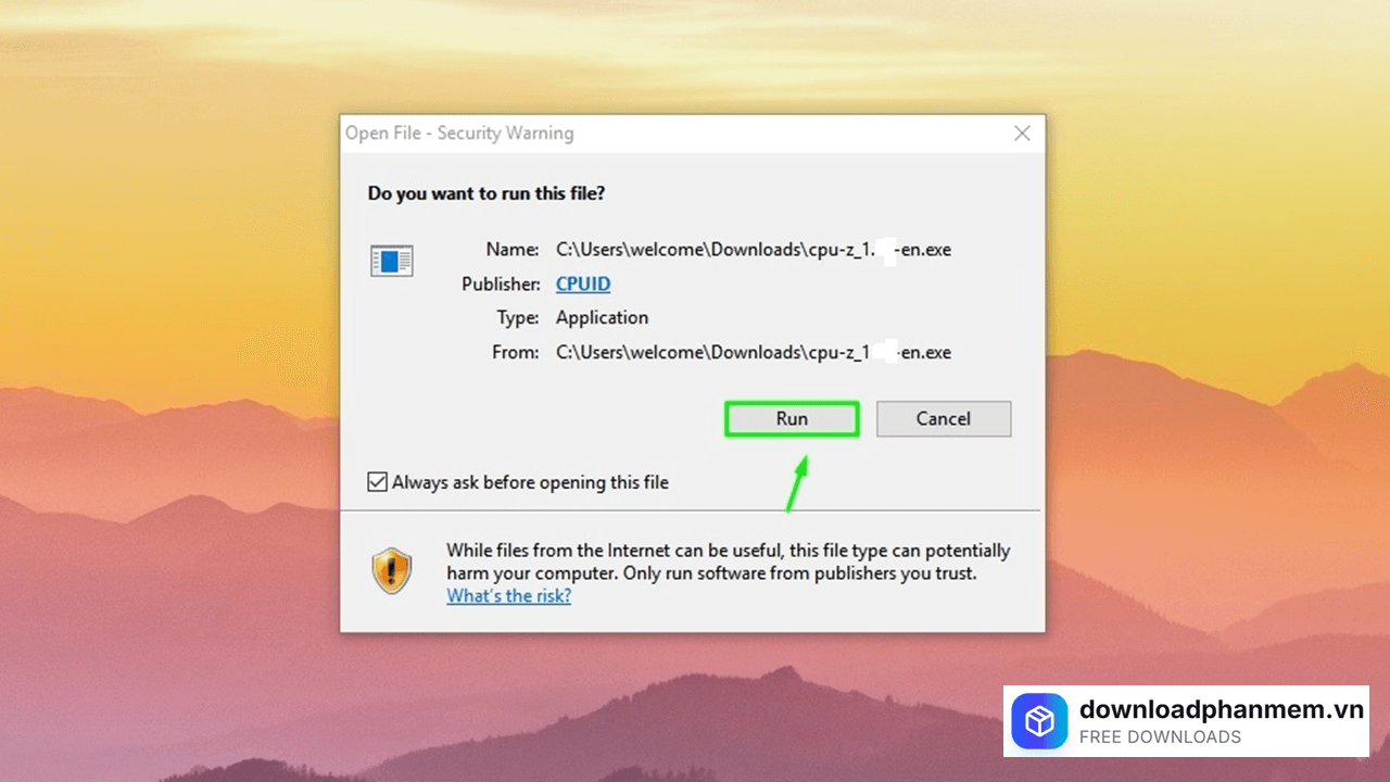 Bước 3: Sau khi tải xong, bạn mở file vừa tải về (thường có tên cpuz_x.xx-setup.exe) và nhấn Run để bắt đầu. Một cửa sổ thiết lập sẽ hiện lên: