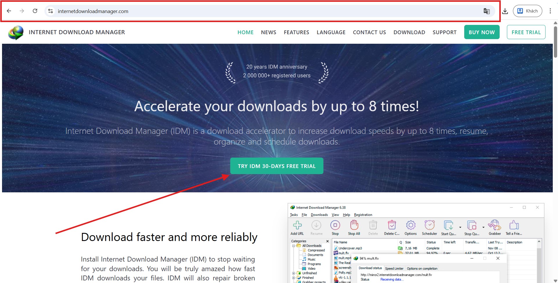 - Bước 1: Truy cập trang chủ của Internet Download Manager tại internetdownloadmanager.com. Tại đây bạn sẽ thấy nút “TRY IDM 30-DAYS FREE TRIAL” hoặc “DOWNLOAD INTERNET DOWNLOAD MANAGER”. Nhấn vào đó để tải file cài đặt IDM.