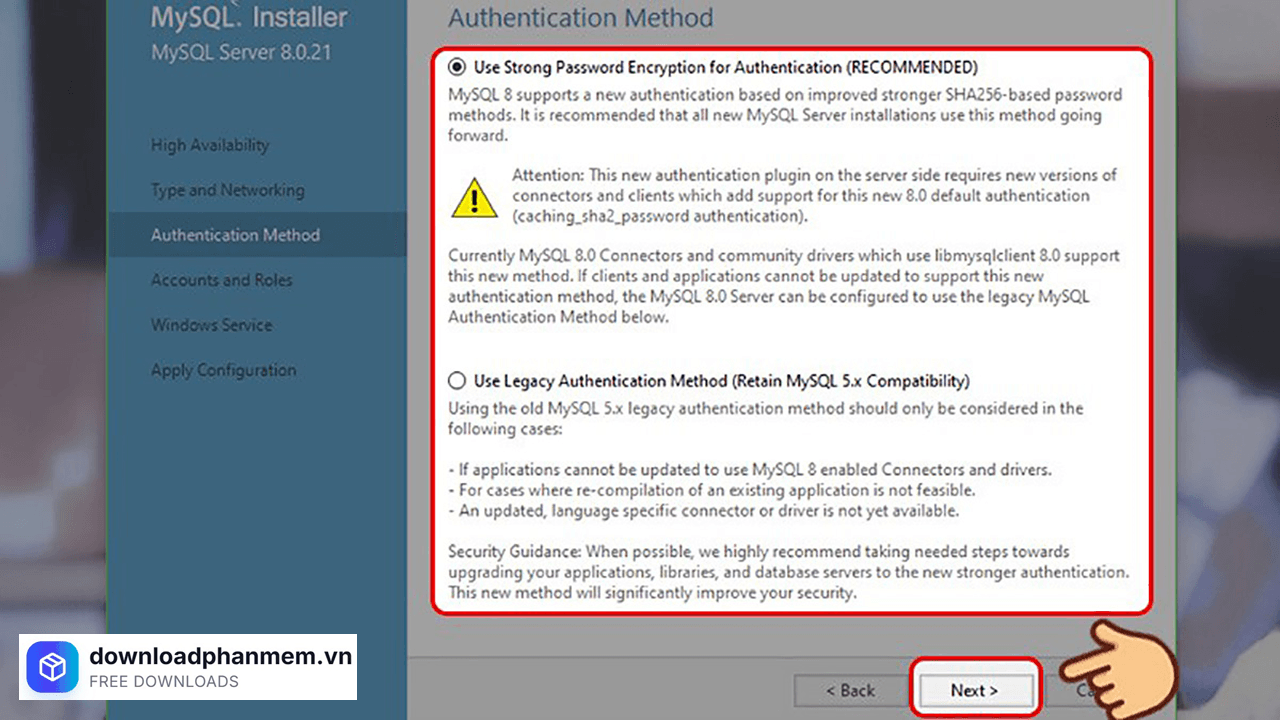 - Khi cài đặt, hãy chọn phương thức "Use Legacy Authentication Method" nếu bạn sử dụng các công cụ kết nối cũ.