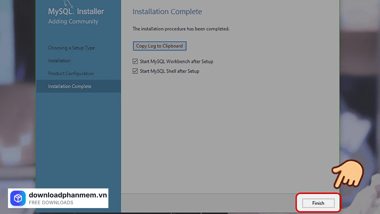 - Bước 5: Cuối cùng, tại cửa sổ Installation Complete, bạn chỉ cần nhấn Finish. Hệ thống sẽ tự động kích hoạt các dịch vụ của MySQL chạy ngầm trong máy tính. Bây giờ, bạn đã có thể mở MySQL Workbench hoặc dòng lệnh (CMD) để bắt đầu tạo những bảng dữ liệu đầu tiên.