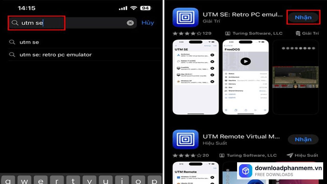 - Bước 1: Mở App Store trên iPhone, tìm kiếm từ khóa "UTM SE" hoặc "UTM SE Retro PC Emulator". Chọn kết quả của nhà phát triển osy2k, nhấn "Nhận" và chờ quá trình tải xuống hoàn tất. Ứng dụng hoàn toàn miễn phí.