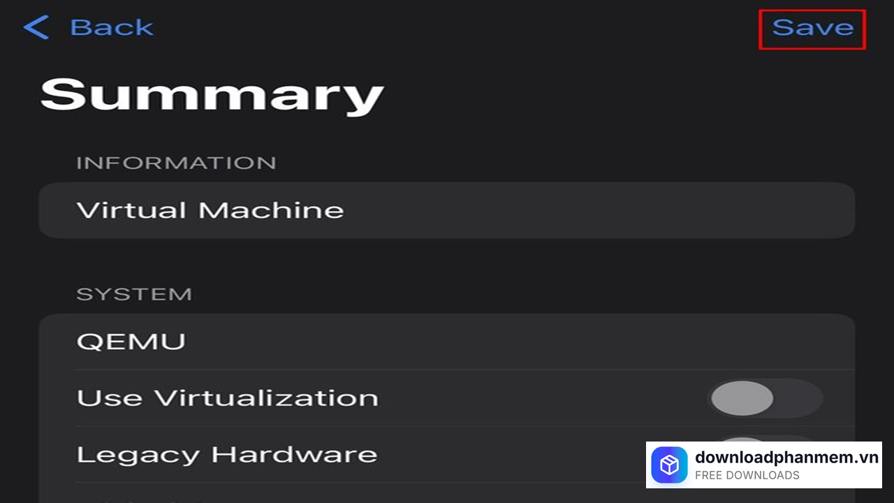 Cài đặt thông số máy ảo và nhấn Save