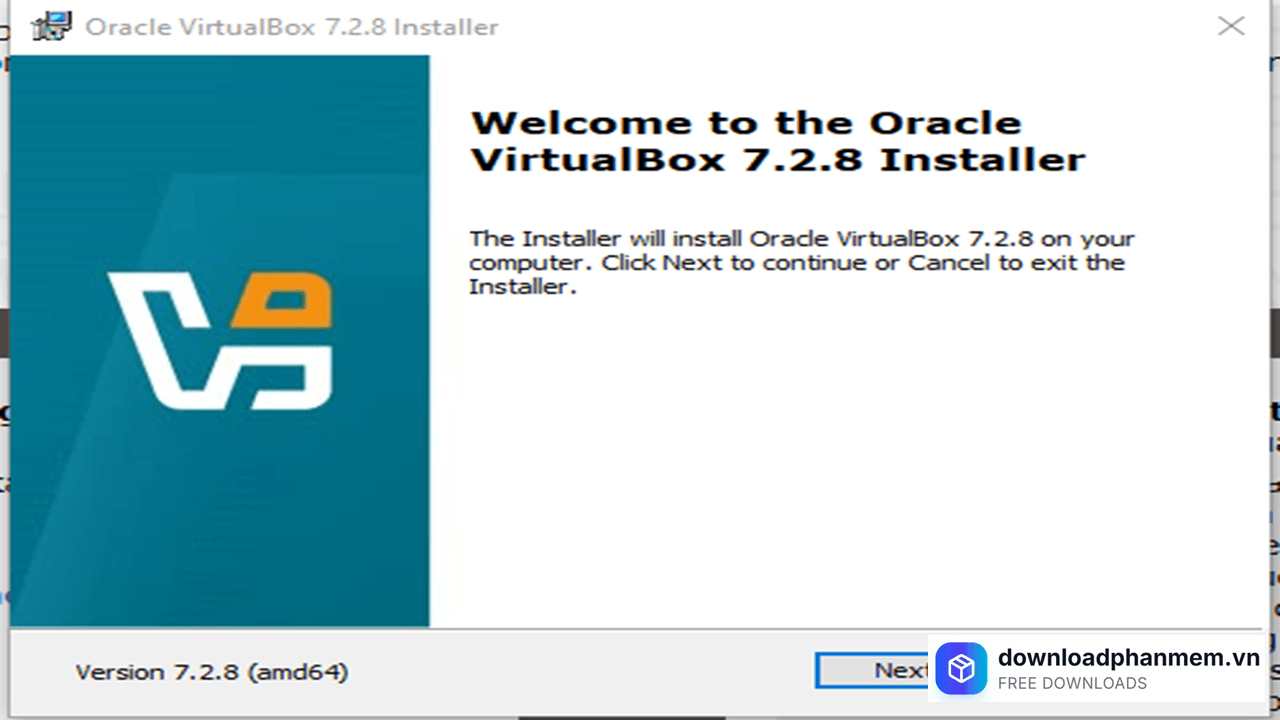 - Bước 2: Tìm tệp tin setup vừa tải về (thường có tên dạng VirtualBox-x.x.x-Win.exe). Nhấp đúp chuột vào file hoặc nhấn chuột phải chọn Run as administrator (Chạy với quyền quản trị) để đảm bảo quá trình cài đặt không bị gián đoạn. Tại màn hình chào mừng, nhấn Next để bắt đầu.