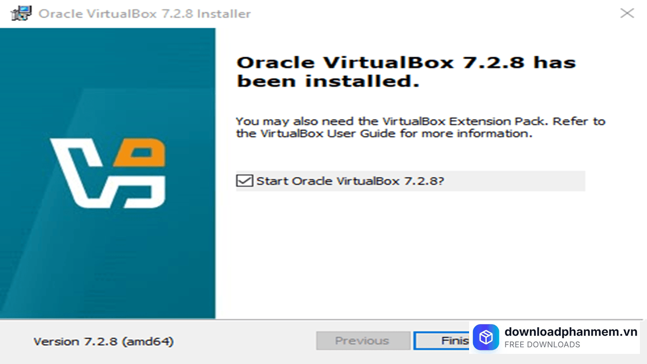 - Bước 7: Sau vài phút chờ đợi, màn hình thông báo cài đặt thành công sẽ hiện ra. Nhấn Finish để đóng trình cài đặt. Bây giờ, biểu tượng VirtualBox đã sẵn sàng trên màn hình để bạn bắt đầu tạo chiếc máy ảo đầu tiên của mình