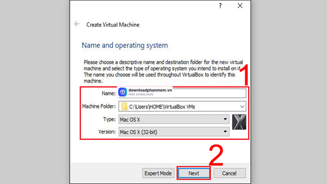 - Type & Version: Chọn đúng hệ điều hành và phiên bản (32-bit hoặc 64-bit) mà bạn dự định cài đặt để VirtualBox tối ưu hóa cấu hình.