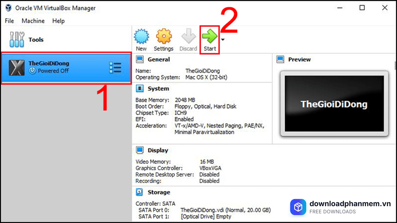- Chọn máy ảo: Nhấp chuột vào tên máy ảo bạn vừa tạo ở danh sách bên trái.